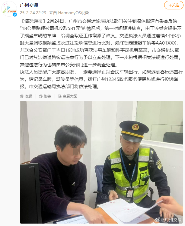 2月24日,广州市交通运输局执法部门关注到媒体报道有乘客反映“18公里路程被司机收取581元”的情况后,第一时间跟进核查。由于该乘客提供不了乘坐车辆的车牌,给调查取证工作增添了难度。交通执法人员通过连续4个多小时大量调取视频监控及过往投诉信息进行比对,最终锁定嫌疑车辆粤AA01XXX,并联合公安部门于当日19时成功查获涉事车辆和涉事司机劳某某。市交通执法部门已对其涉嫌道路客运违章行为予以立案处理,下一步将根据相关法规进行处罚。其他违法行为也转由市公安部门进一步调查处理。