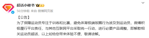 新京报讯 2月27日晚,@超话小秘书 公告:为了保障运动员专注于训练和比赛,避免体育极端饭圈行为波及到运动员,微博积极履行平台责任,与其他互联网平台采取统一行动,进行必要产品调整,即解散相关运动员超话。