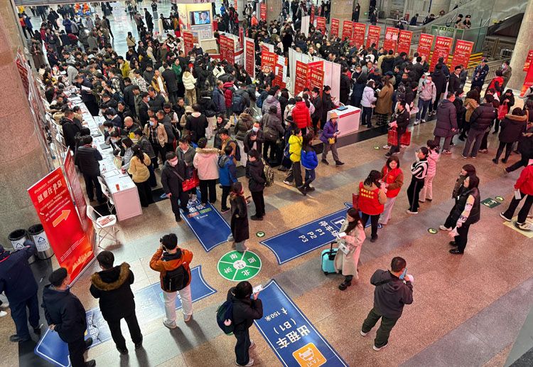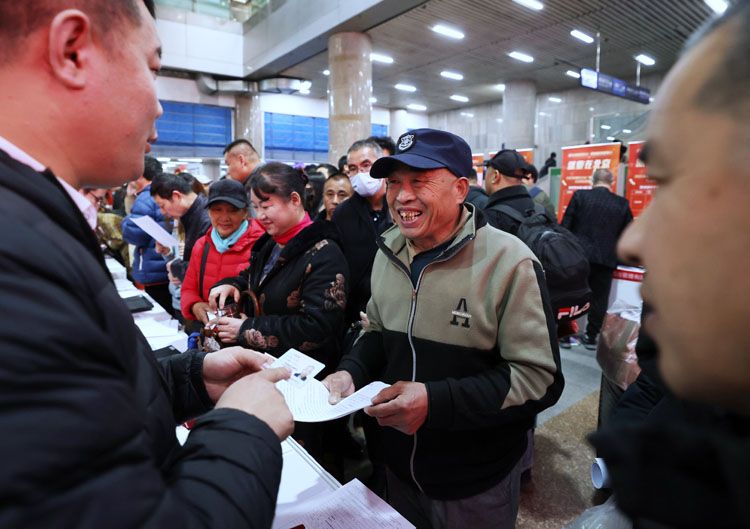 2月28日,北京西站,许多刚下火车的旅客沿着路标指引有序来到招聘会现场,与用人单位面对面交流,实现“出站即求职”。
