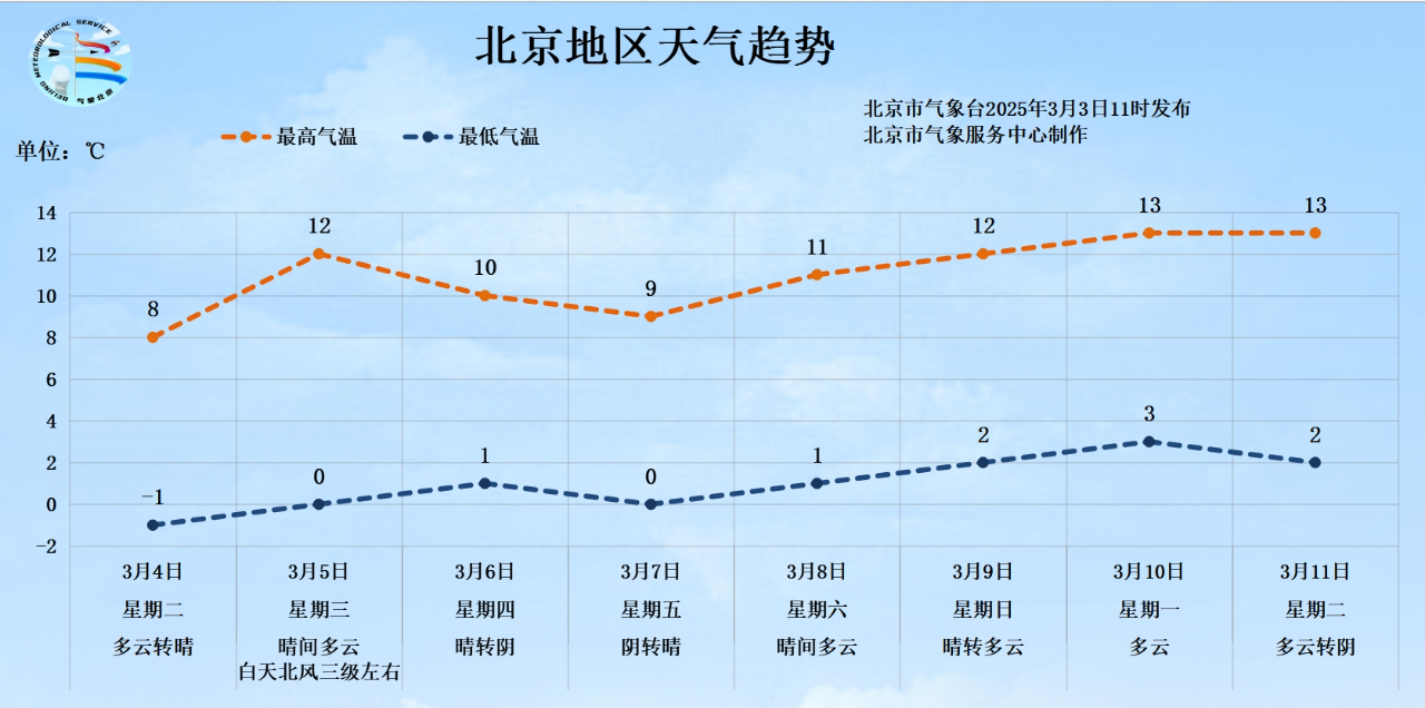 预计3月4日至11日,白天最高气温8℃~13℃,夜间最低气温 -1℃~3℃。