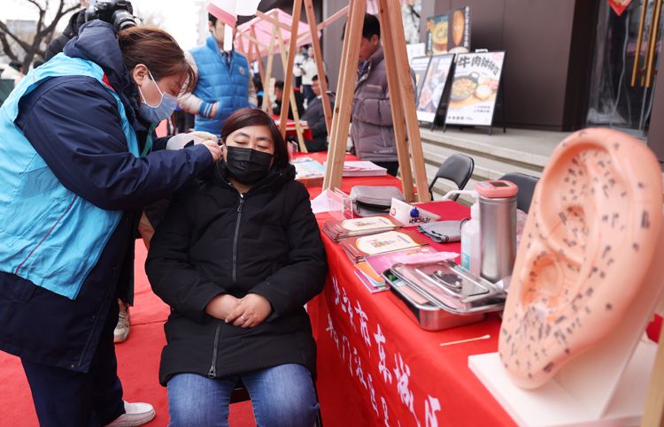 朝阳门社区卫生服务中心医生为居民贴耳豆。活动现场还提供首饰清洗整形、智慧助老养老等便民服务。