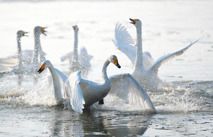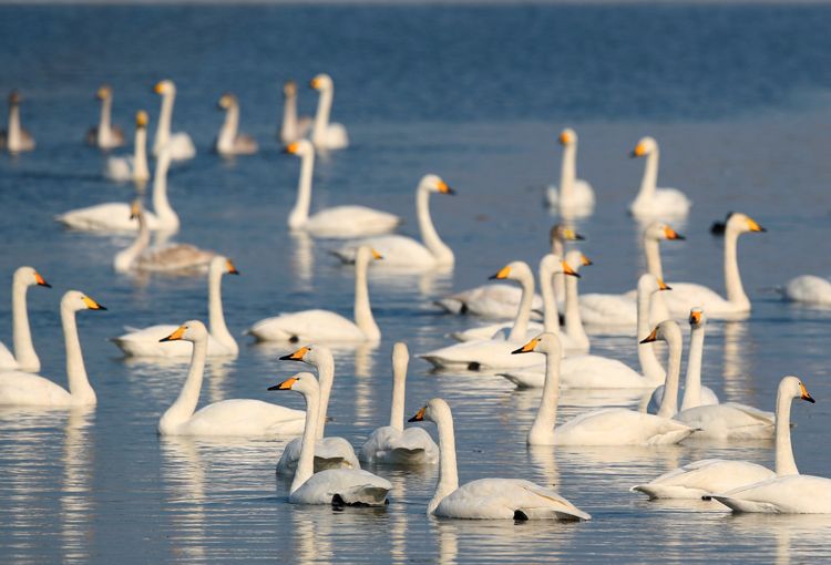 成群的大天鹅和小天鹅在官厅水库的水面上休憩觅食。