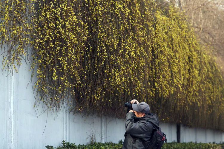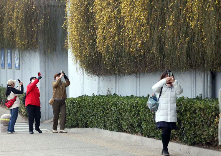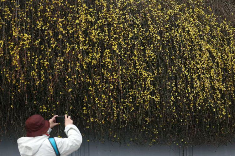 迎春花簇拥在细长的枝条上,吸引摄影爱好者驻足拍摄。