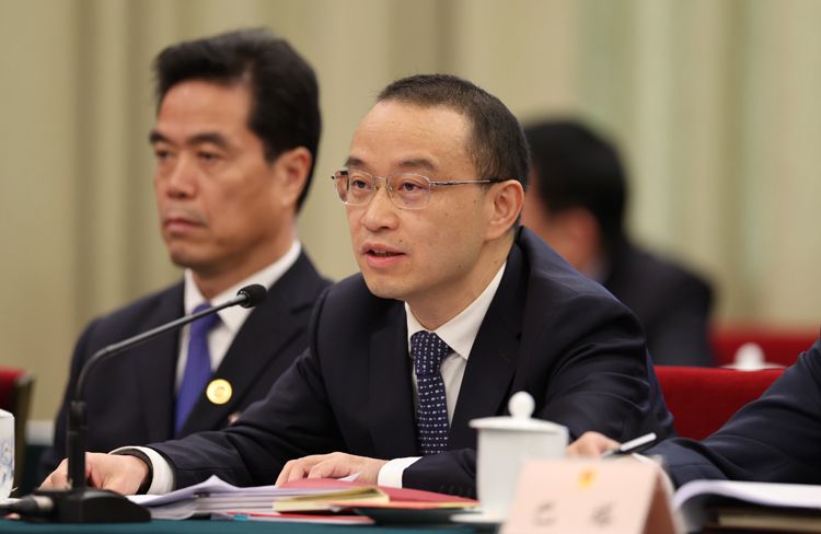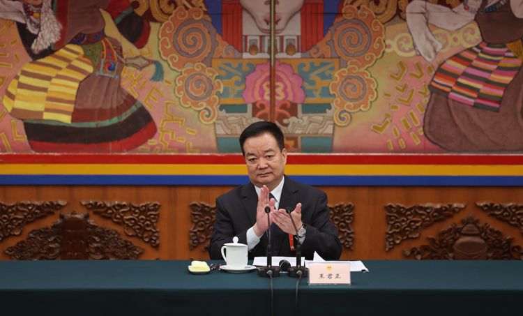 全国人大代表、西藏自治区党委书记王君正鼓掌欢迎中外媒体记者。
