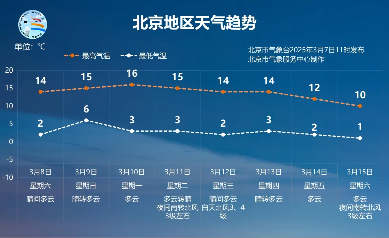 下周北京气温先升后落,仍有起伏,早晚气温依然较低。季节交替时节,还请及时关注气温变化,适时调整着装,谨防感冒。预计3月8日至15日,白天最高气温10℃至16℃,夜间最低气温1℃至6℃。