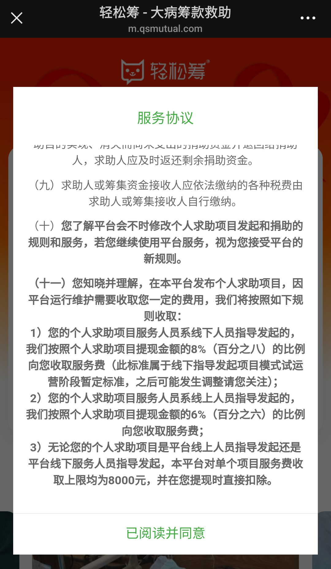 轻松筹的《服务协议》第四款第十一条规定,对于线下人员指导发起的筹款项目,服务费收取比例是8%,并提示,“此标准属于线下指导发起项目模式试运营阶段暂定标准,之后可能发生调整请您关注”。线上人员指导发起的筹款项目服务费仍按6%收取。单个项目服务费收取上限均为8000元。