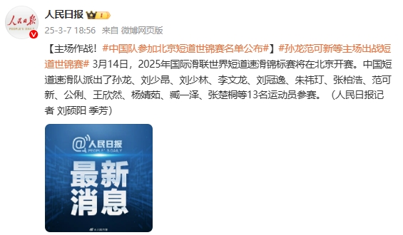 据@人民日报消息,3月14日,2025年国际滑联世界短道速滑锦标赛将在北京开赛。中国短道速滑队派出了孙龙、刘少昂、刘少林、李文龙、刘冠逸、朱祎玎、张柏浩、范可新、公俐、王欣然、杨婧茹、臧一泽、张楚桐等13名运动员参赛。(人民日报记者 刘硕阳 季芳)