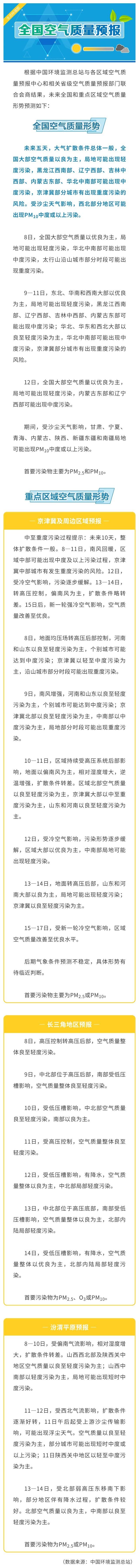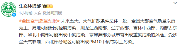 新京报讯 据生态环境部官博消息,未来五天,大气扩散条件总体一般,全国大部空气质量以良为主,局地可能出现轻度污染,黑龙江西南部、辽宁西部、吉林中西部、内蒙古东部、华北中南部可能出现中度污染,京津冀部分城市有出现重度污染的风险。受沙尘天气影响,西北部分地区可能出现PM10中度或以上污染。
