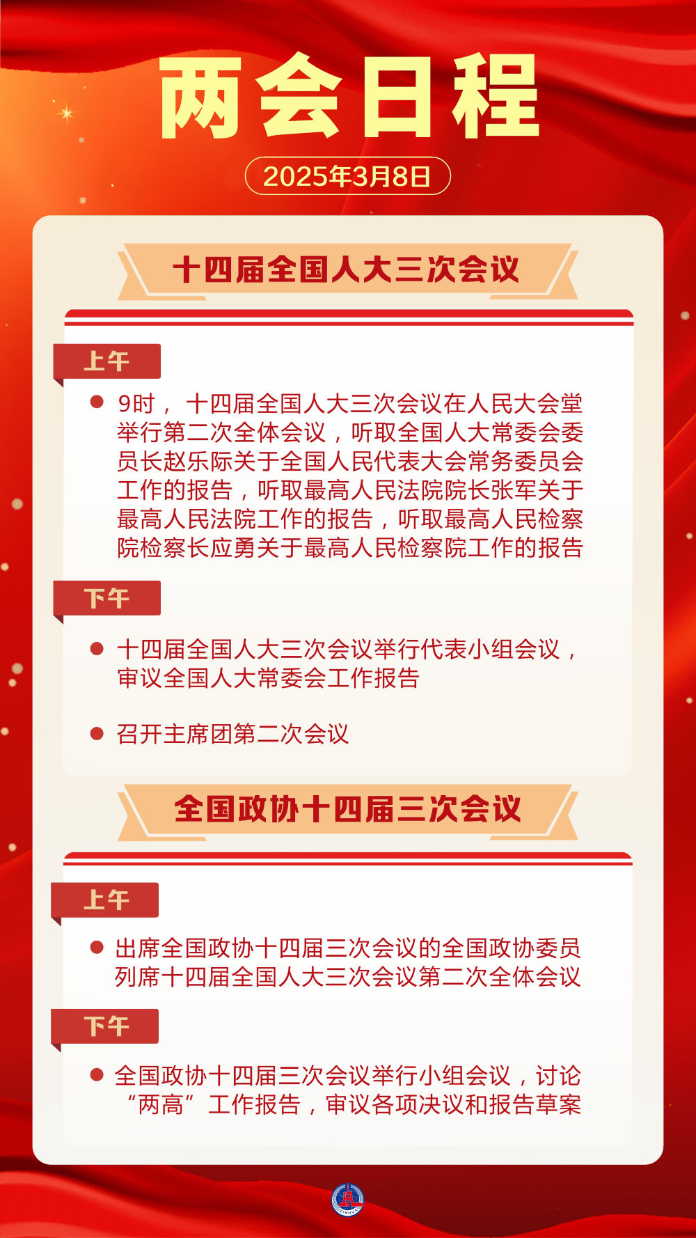 两会日程预告丨3月8日:全国人代会举行第二次全体会议 听取全国人大常委会工作报告和“两高”工作报告