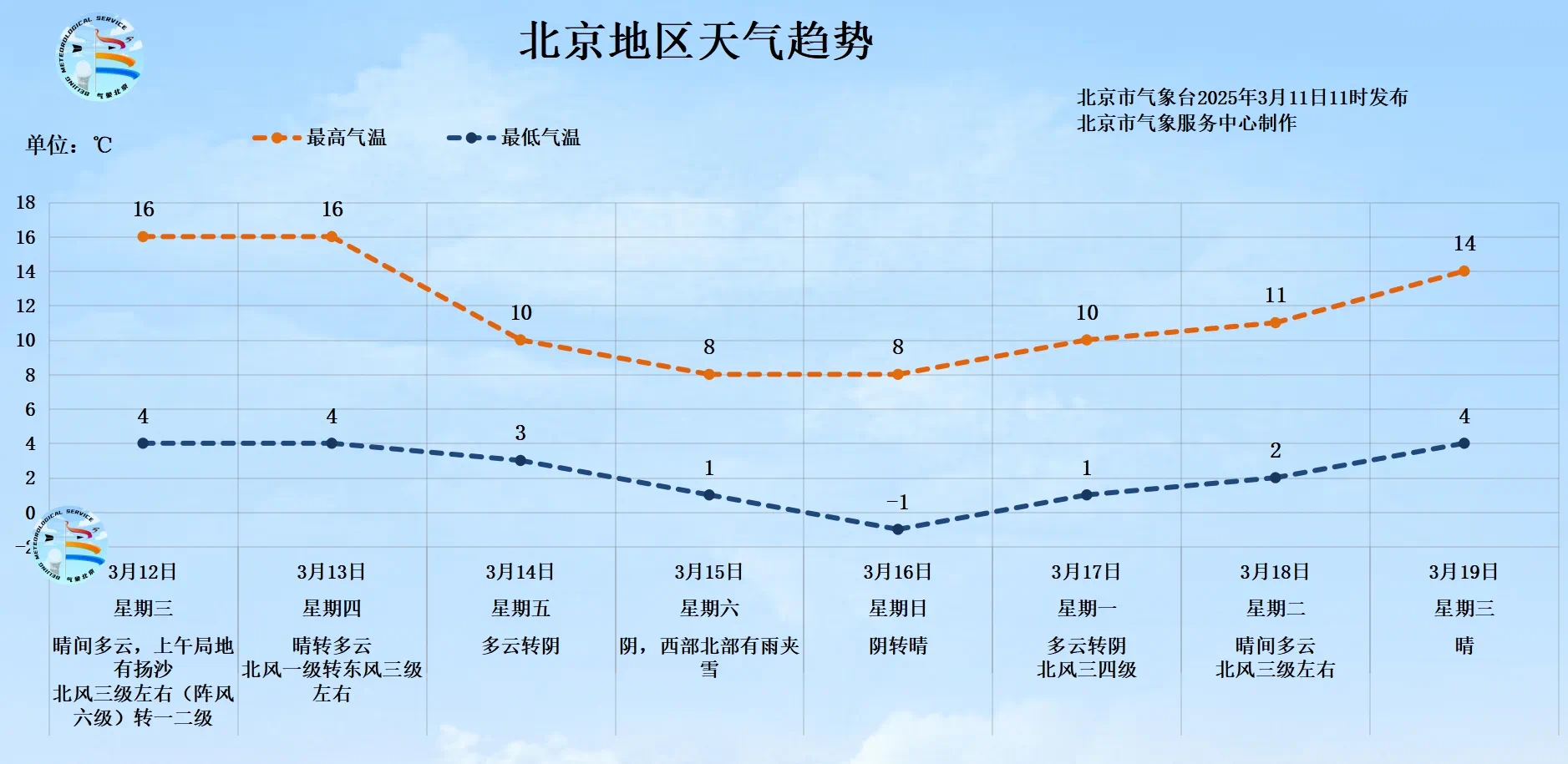 3月17日开始天气逐渐转晴,气温缓慢回升;但17日至18日气温仍处于偏低水平,厚衣服先别急着收。预计3月12日至19日,白天最高气温8℃至16℃,夜间最低气温 -1℃至4℃。