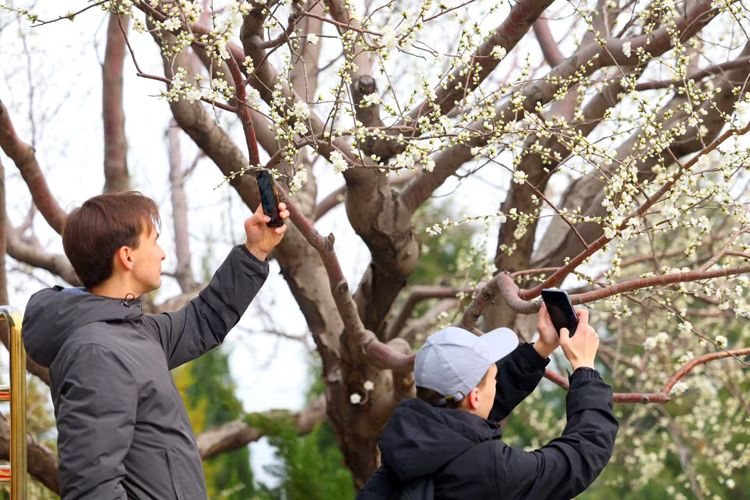 3月11日,景山公园,游客拍摄盛开的山桃花。伴随气温升高,公园内的梅花、山桃花和望春玉兰次第开放,引来众多游客登高赏花。