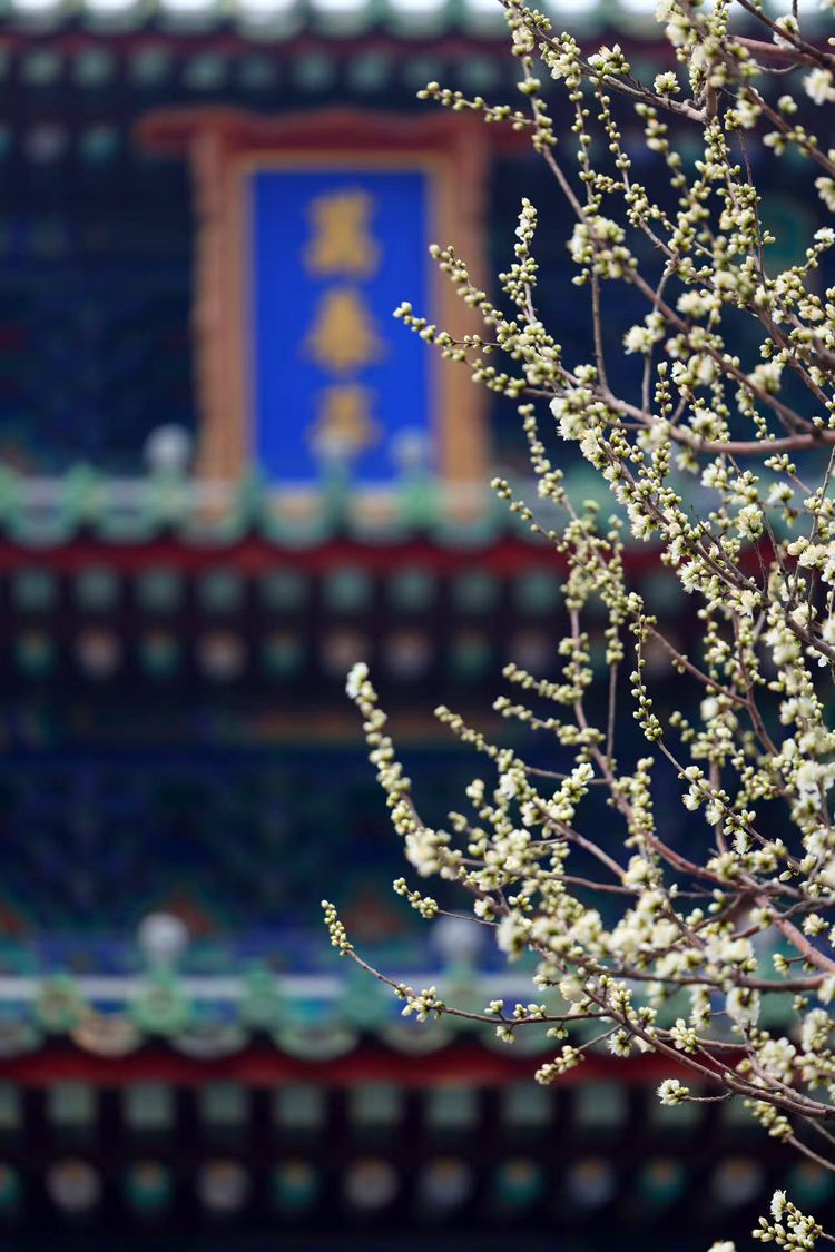 3月11日,景山公园万春亭,山桃花初绽芳颜。
