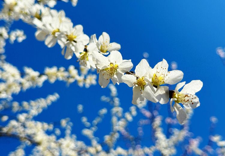 桃花竞相绽放,簇拥在枝头争奇斗艳。