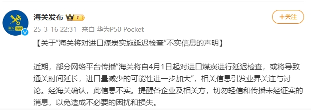 新京报讯 据@海关发布微博消息,近期,部分网络平台传播“海关将自4月1日起对进口煤炭进行延迟检查,或将导致通关时间延长,进口量减少的可能性进一步加大”,相关信息引发业界关注与讨论。经海关确认,此信息不实。提醒各企业及相关方,切勿轻信和传播未经证实的消息,以免造成不必要的困扰和损失。