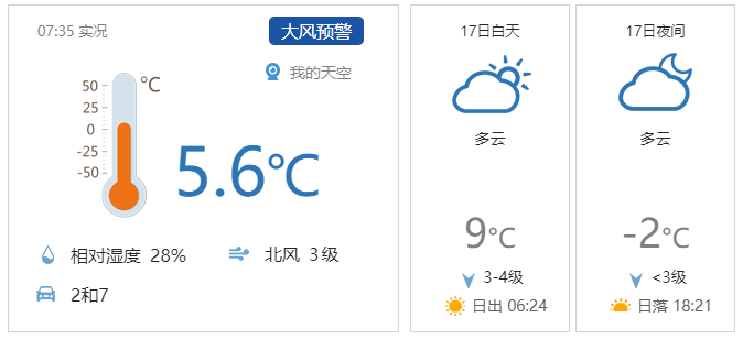今天白天多云间晴,北风四级左右(阵风七八级),最高气温9℃;夜间多云转晴,北风一二级,最低气温-2℃。