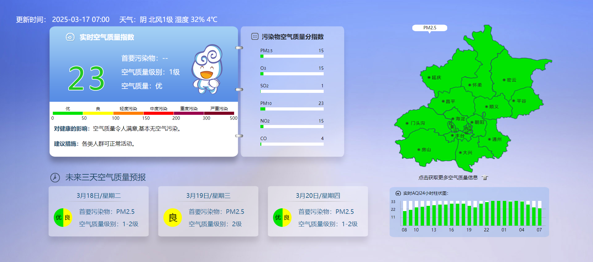 据北京市生态环境监测中心今早7时数据,目前实时空气质量指数23,空气质量级别1级,空气质量优。