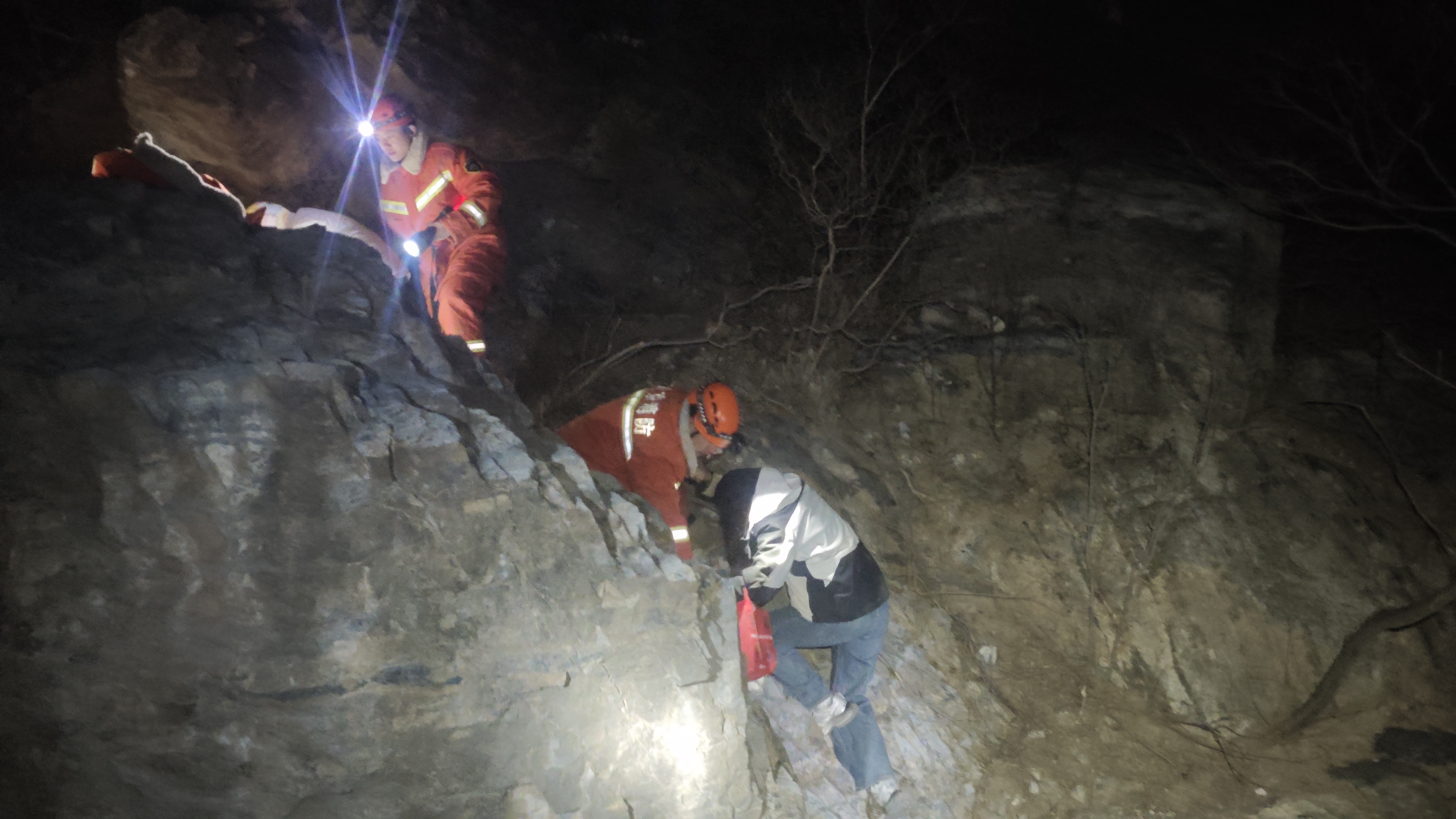 斋堂消防救援站迅速派出一车八人赶赴现场,在集结点与民警和当地镇政府工作人员会合后,通过微信共享实时位置,锁定了被困母子的具体位置。随后,他们携带药品、应急食品、保暖衣物等救援物资上山救援。
