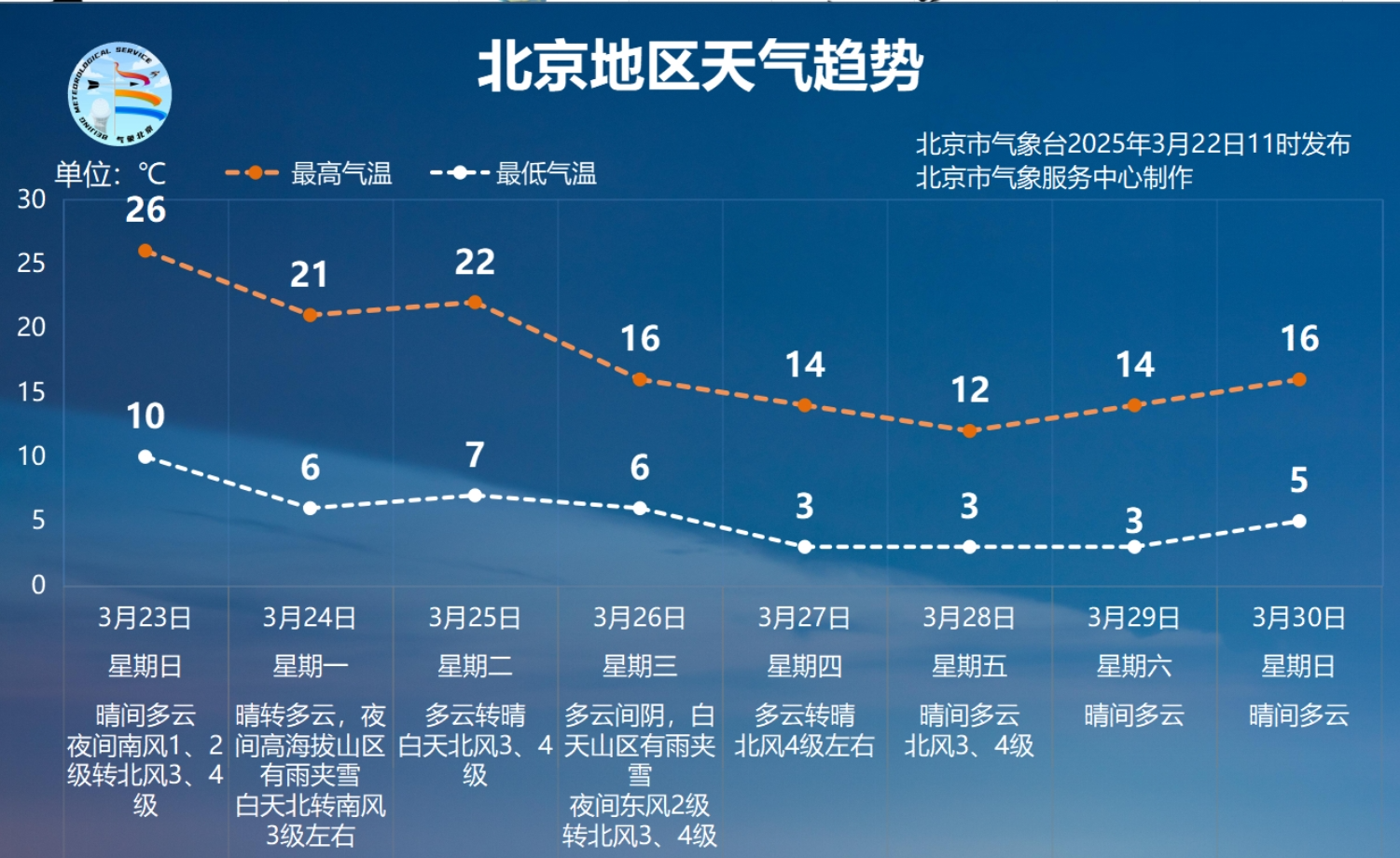 明天依旧是晴空暖阳都在线。但是,下周有多股冷空气影响北京,多大风天气,气温也将阶梯式下降,预计最高气温将从22℃下降至12℃。季节交替,气温起伏大,还请大家及时关注天气变化,根据个人情况,及时调整着装,特别是早晚出行仍需注意保暖。预计3月23日至3月30日,北京白天最高气温12℃至26℃,夜间最低气温3℃至10℃。