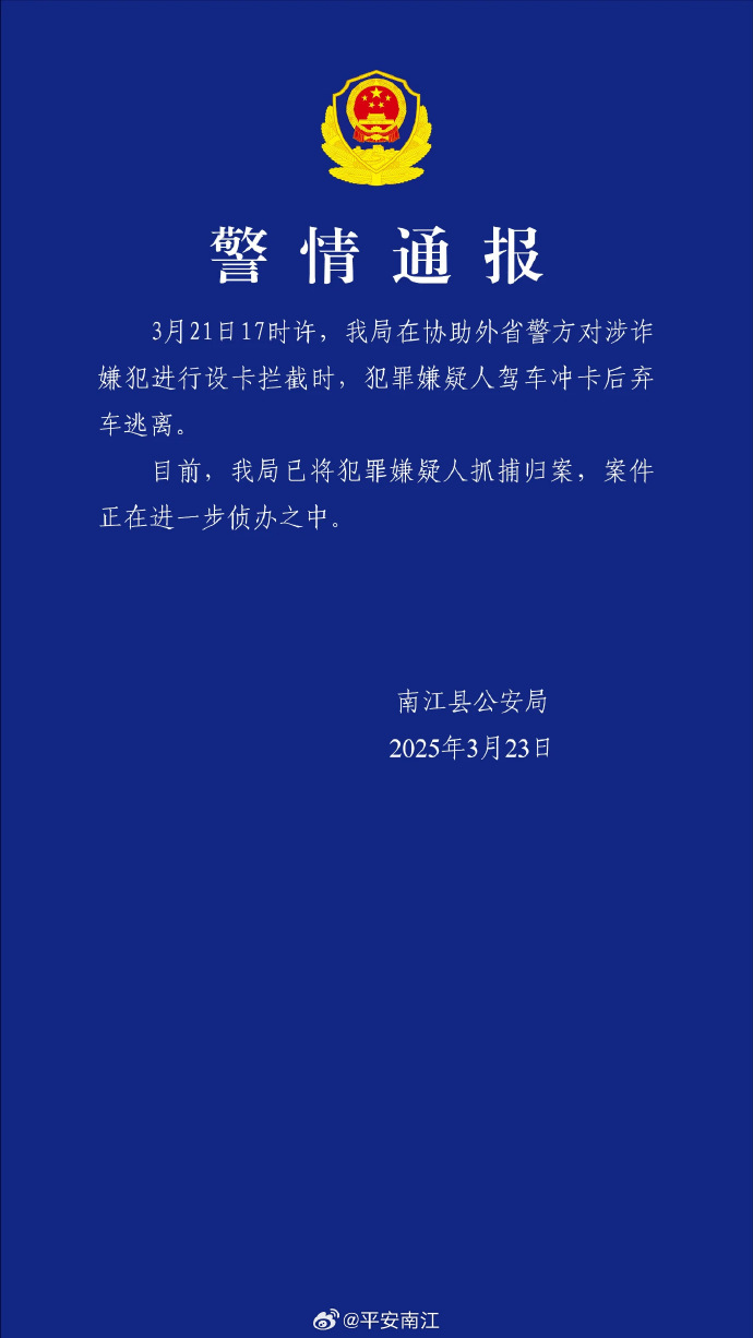 四川南江警方:涉诈嫌疑人冲卡后弃车逃离,已被抓捕归案
