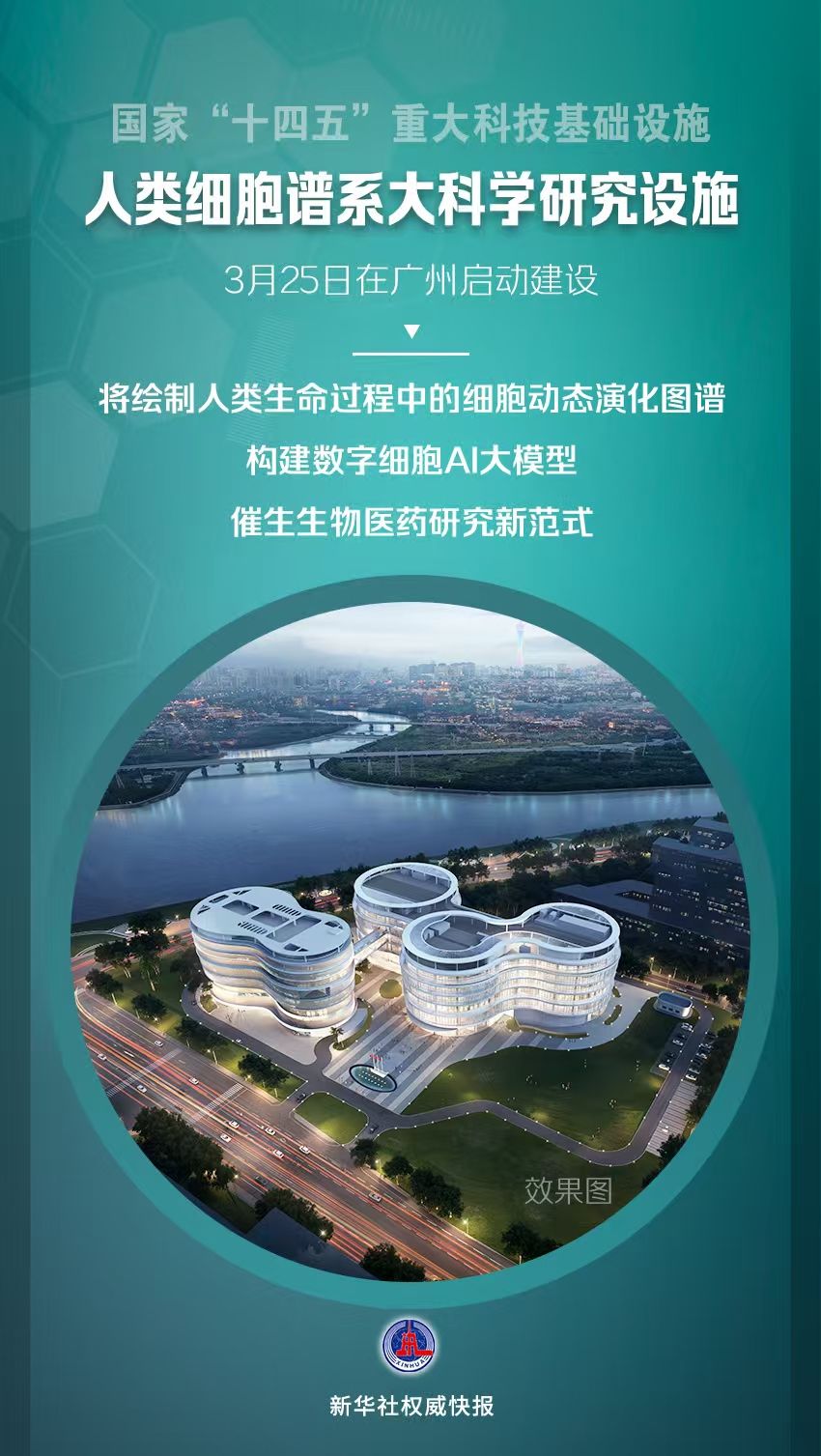 据新华社广州3月25日电 人类细胞谱系大科学研究设施25日在广州启动建设,将绘制人类生命过程中的细胞动态演化图谱,构建数字细胞AI大模型,催生生物医药研究新范式。