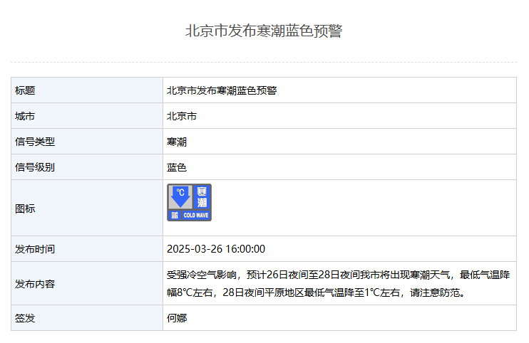 最低气温降幅8℃左右,北京市发布寒潮蓝色预警