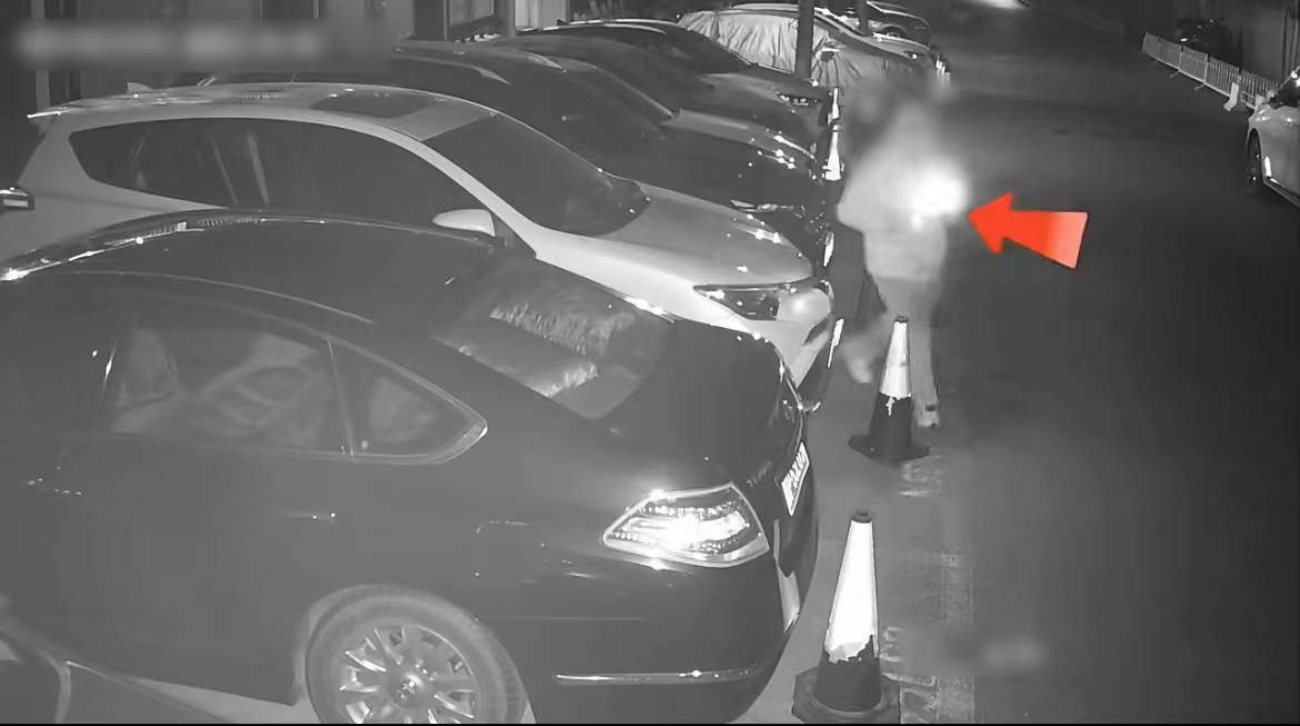 男子凌晨三四点时在小区停车区内转悠,娴熟快速地将小广告贴在每一辆轿车后视镜上。