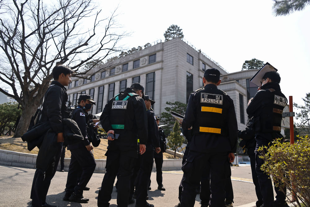 4月3日,在韩国首尔,警察在韩国宪法法院前执勤。新华社记者姚琪琳摄