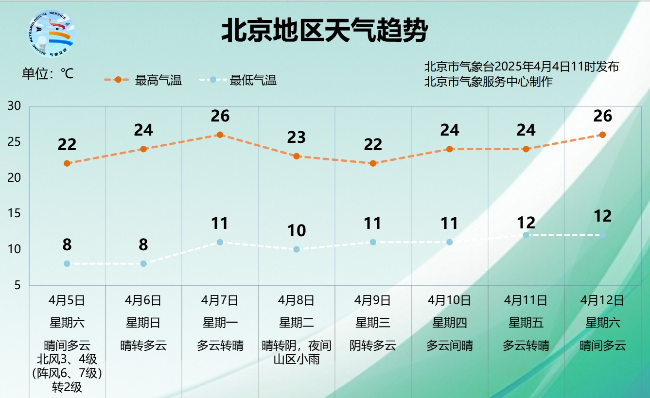 今天是清明假期第一天,北京市天空云量稍有增多,山区还有分散性小阵雨,午后北风逐渐加大,最高气温21℃左右,夜间最低气温7℃左右。未来几天气温较稳定,但昼夜温差大,外出游玩要注意适时调整着装,早晚还要注意保暖,谨防感冒。明天(4月5日)明天白天晴间多云,但依旧有北风在线,北风三级左右(阵风六七级)转南风二级,最高气温22℃,假期出游还需注意防风。后天(4月6日)风力明显减小,气温稳定上升,适宜踏青郊游,户外游园赏花、坐坐游船。目前玉渊潭中樱正在绽放,晚樱还需等上几天;碧桃、海棠、丁香花正处于盛花期。不过,随着天气一天天转暖,恼人的杨柳飞絮也将逐渐进入始发期,需提前做好防御准备。下周气温总体呈现逐渐回升的趋势,预计4月5日至4月12日,白天最高气温22℃~26℃,夜间最低气温8℃~12℃。北京地区天气趋势。图源:“气象北京”微信公众号