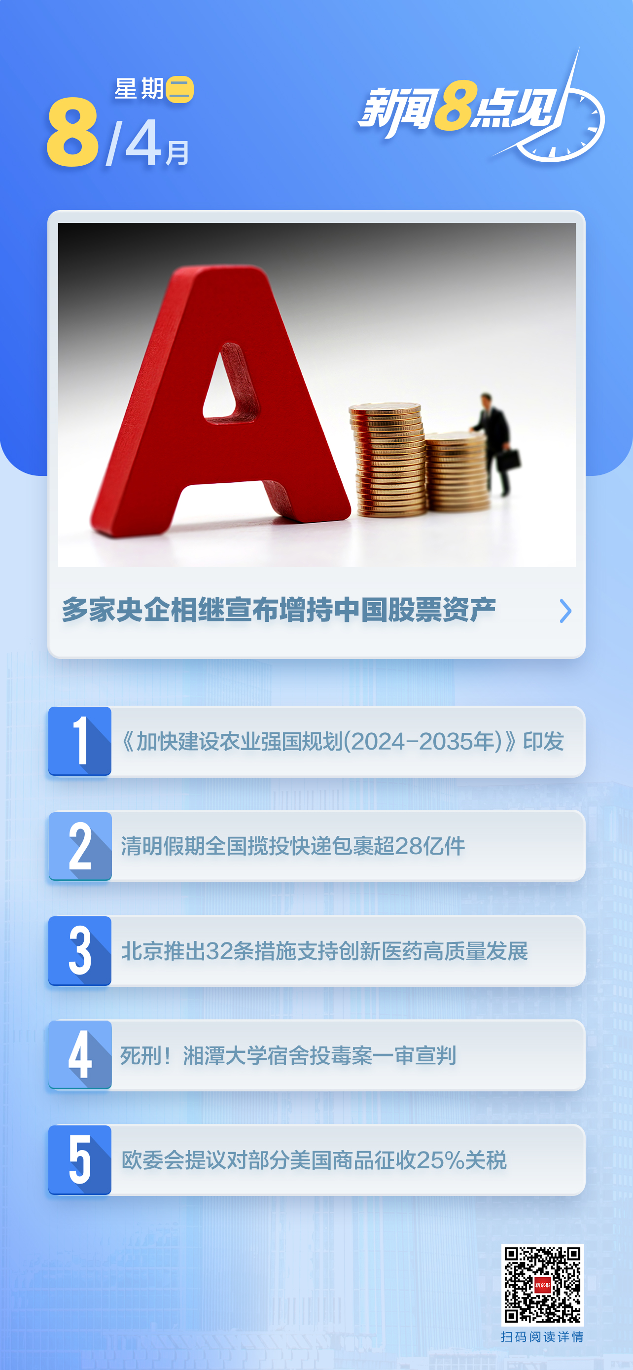 中国国新表示,旗下国新投资有限公司将以股票回购增持专项再贷款方式增持中央企业股票、科技创新类股票及ETF等,首批金额为800亿元。(央视新闻)