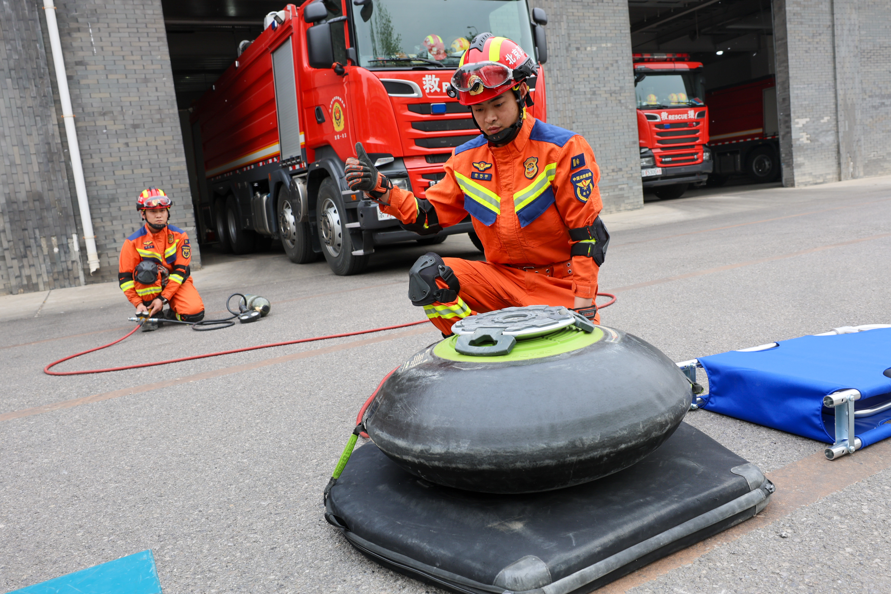消防救援人员正在给球形起重气垫冲压,测试其是否性能良好。 新京报记者 王子诚 摄