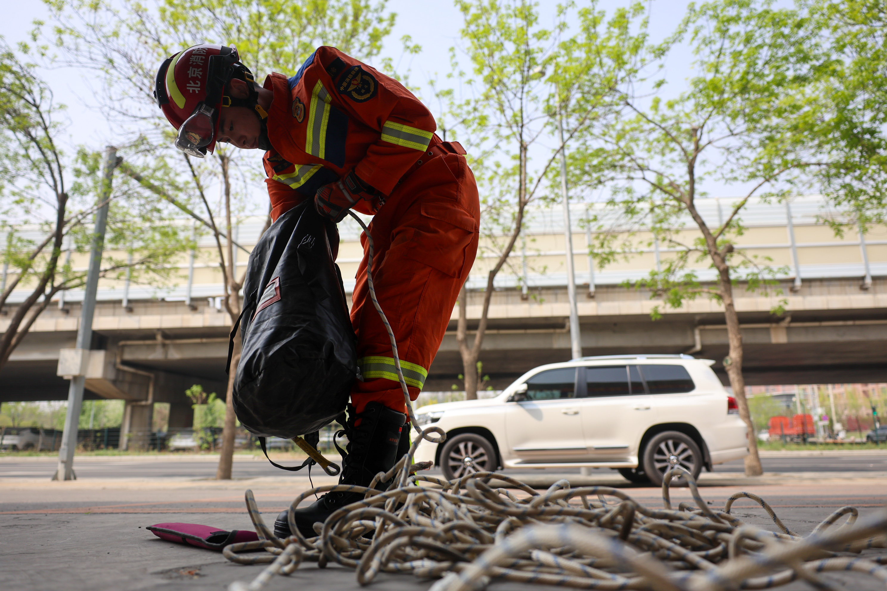 消防救援人员正在整理救援绳索。 新京报记者 王子诚 摄