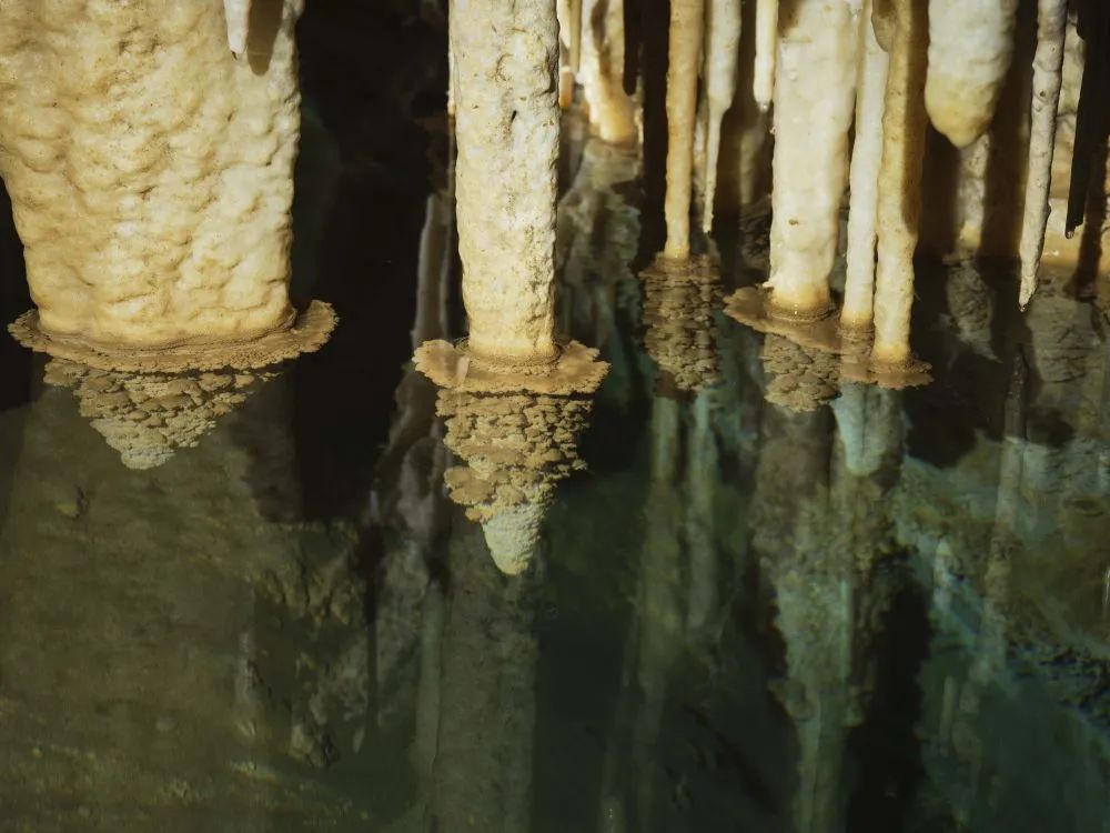 探险队员在洞内发现的纺缍石景观。新华社发(赵揭宇 摄)