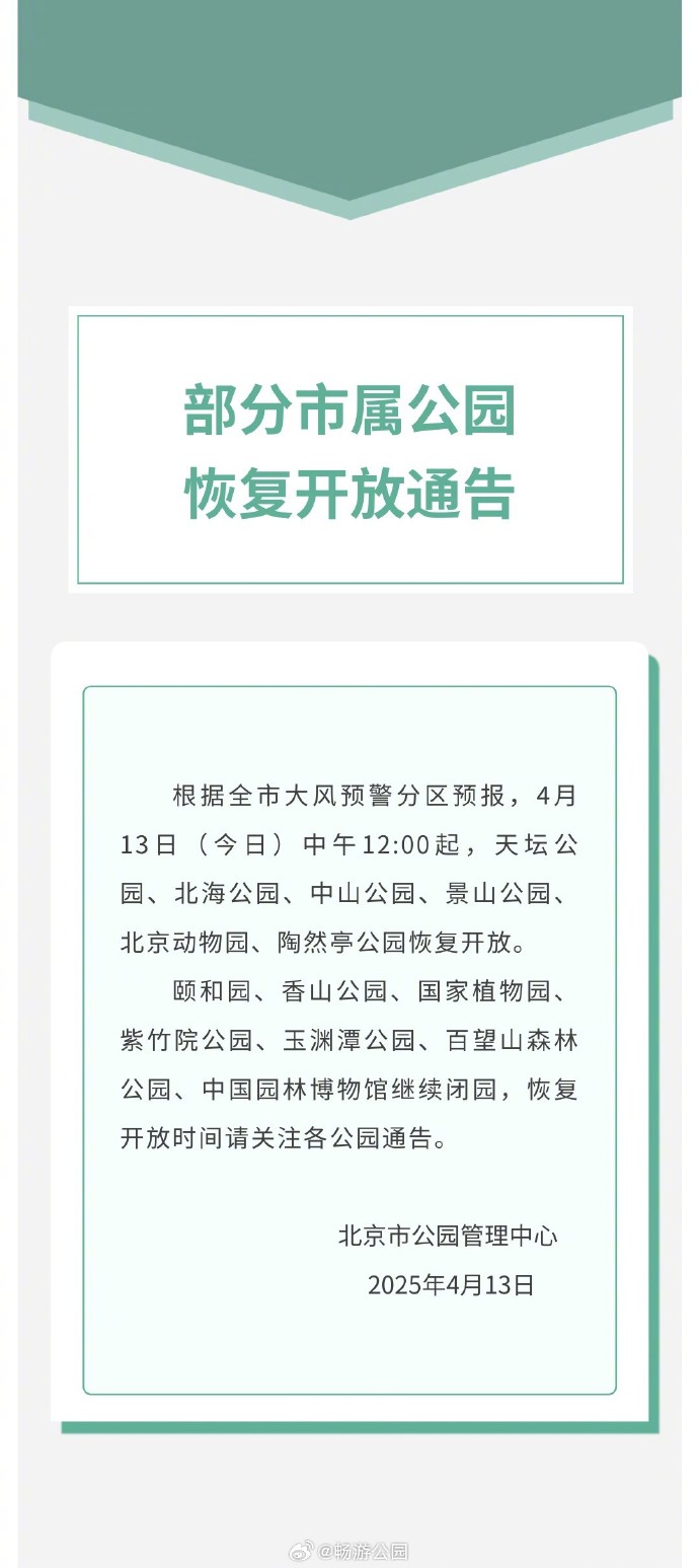 新京报讯 4月13日,北京市公园管理中心发布通告: