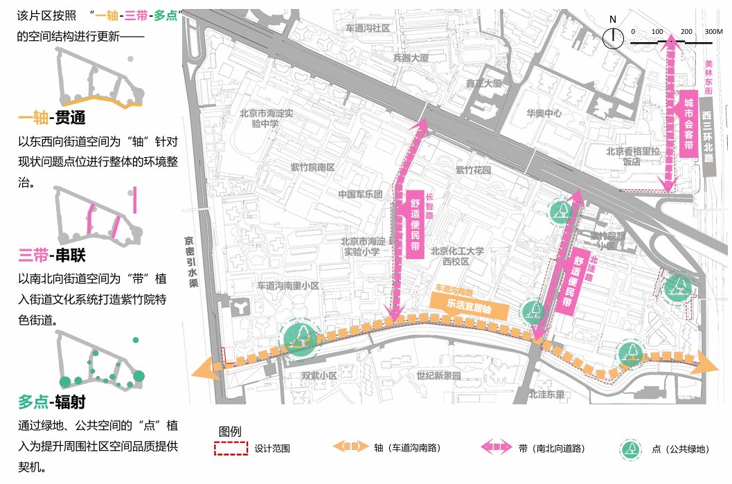 作为紫竹院街道众多片区之一,提升前,车道沟片区存在道路破损、空间不足、围墙立面风貌差、绿化及设施不足等问题。针对以上问题,项目以推动开放式街区建设为目标,以“织路透绿,‘车道’新生”为主题,对西三环北路、北洼路、车道沟南路、长智路以及美林东街5条道路及路侧公共空间进行环境整治提升,形成 “一轴-三带-多点”的空间布局,实施 “一路一策”,增加片区亮点,5.5公里长的改造区域辐射9个社区,惠及6.5万居民,将通过道路更新、拆墙透绿、绿化提升和公共空间改造等策略,打造一个宜居、绿色、开放的城市环境。