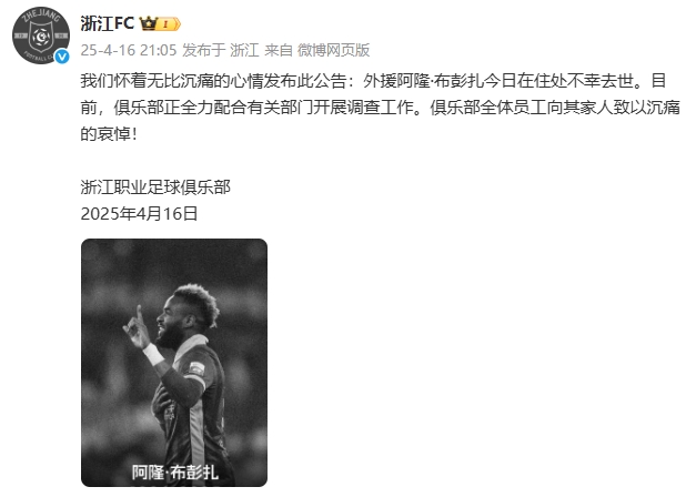 新京报讯 4月16日,浙江职业足球俱乐部发文称:我们怀着无比沉痛的心情发布此公告:外援阿隆·布彭扎今日在住处不幸去世。目前,俱乐部正全力配合有关部门开展调查工作。俱乐部全体员工向其家人致以沉痛的哀悼!
