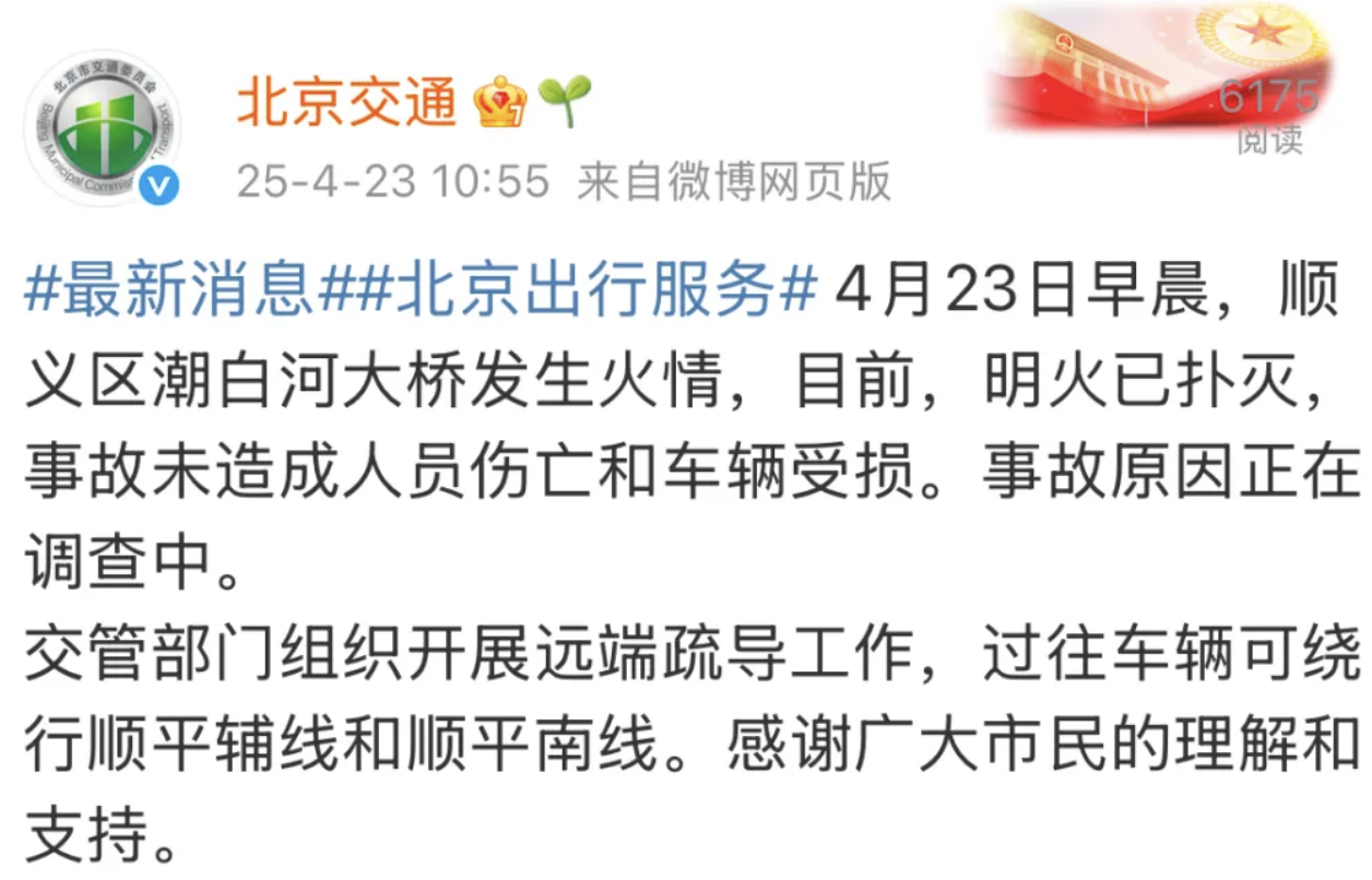 “潮白河大桥火情”最新情况:明火已扑灭,事故原因正在调查中