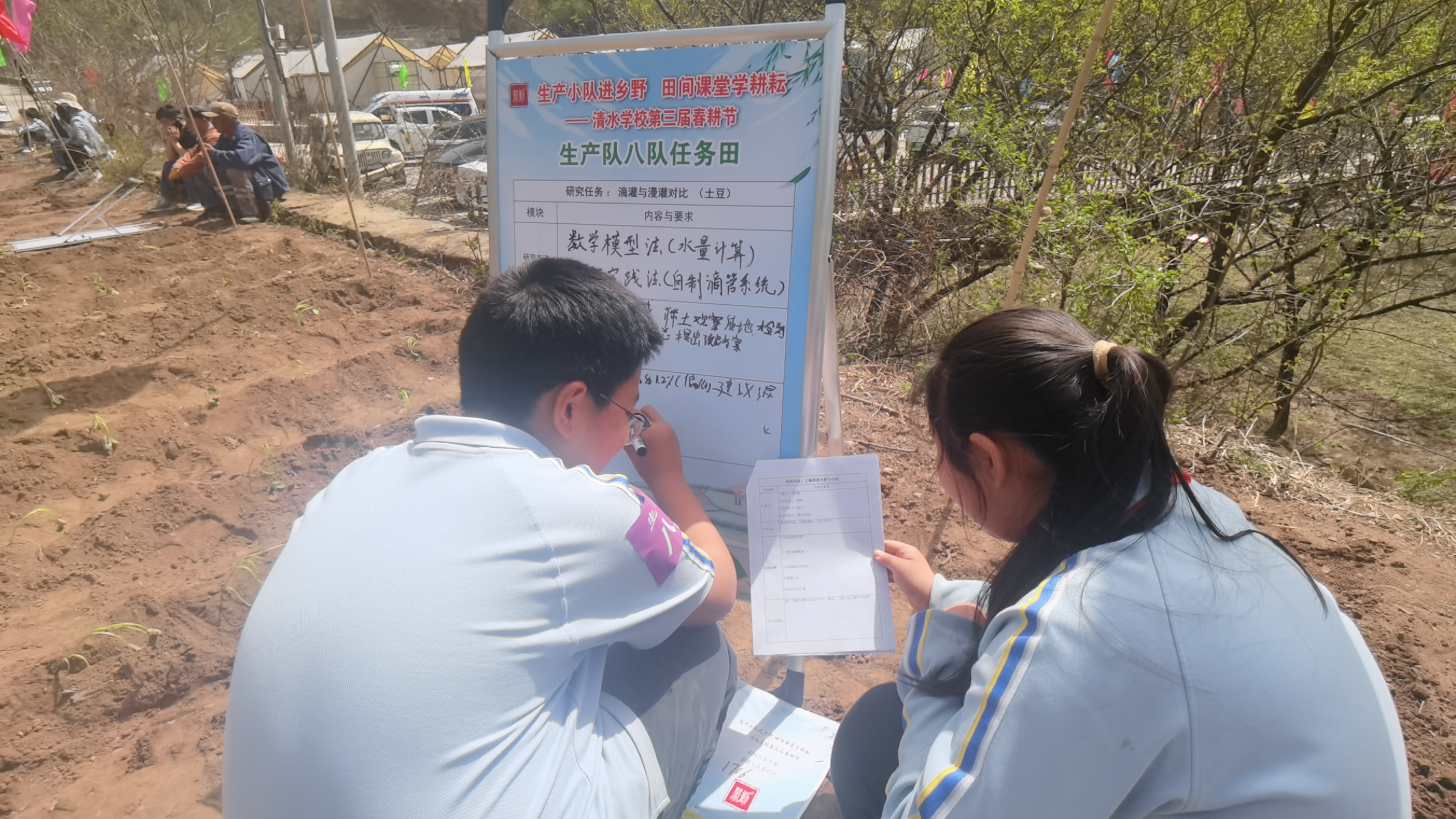尽管这是一场田野中的农耕体验,但依然是一场科技春耕,除了展示学生的发明,每一个“生产小队”还有各自的科研任务。他们要在春耕中,完成土壤肥力调查、覆膜种植对比等各种实验,最后还要在“田间报告厅”中,汇报各自的发现与成果。