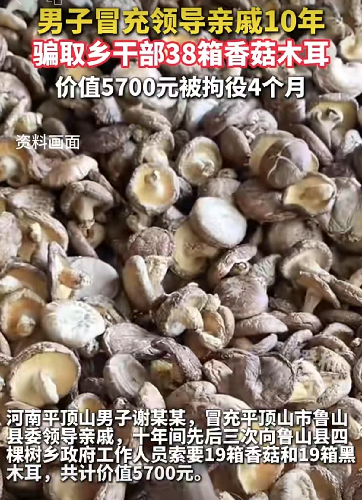 近日,据澎湃新闻报道,河南平顶山男子谢某某,冒充平顶山市鲁山县委领导亲戚,十年间先后三次向鲁山县四棵树乡政府工作人员索要19箱香菇和19箱黑木耳,共计价值5700元。谢某某一审被判拘役四个月,并处罚金3000元。