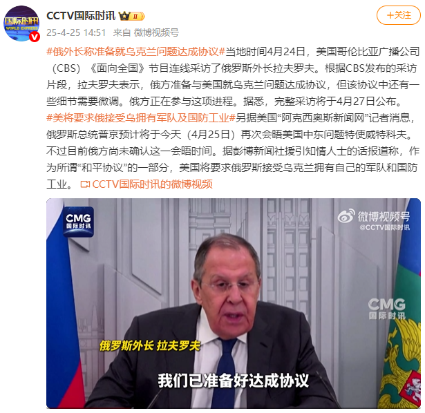 据@CCTV国际时讯 消息,当地时间4月24日,美国哥伦比亚广播公司(CBS)《面向全国》节目连线采访了俄罗斯外长拉夫罗夫。根据CBS发布的采访片段,拉夫罗夫表示,俄方准备与美国就乌克兰问题达成协议,但该协议中还有一些细节需要微调。俄方正在参与这项进程。据悉,完整采访将于4月27日公布。