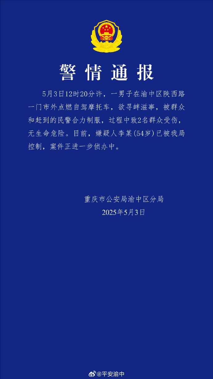 一男子点燃自驾摩托车欲寻衅滋事 重庆警方:已被控制,2人受伤