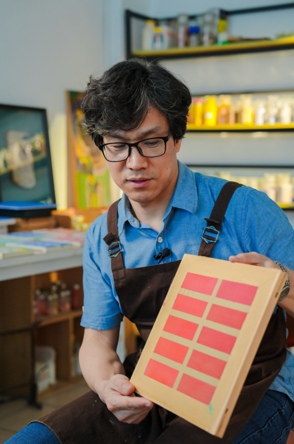为了以传统技艺还原五色的色彩样本,何韵旺认真研读相关历史文献,仔细研磨朱砂、蓝铜、雌黄等矿石和高岭土,并以“水飞澄汰”等古法进行加工。