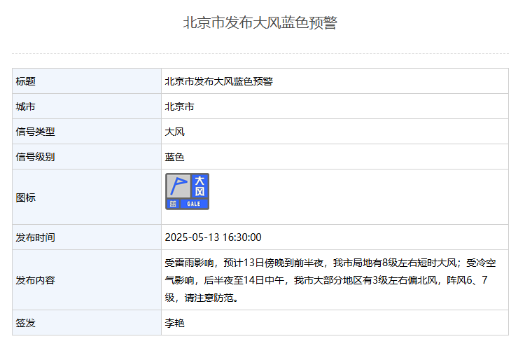 北京市发布大风蓝色预警