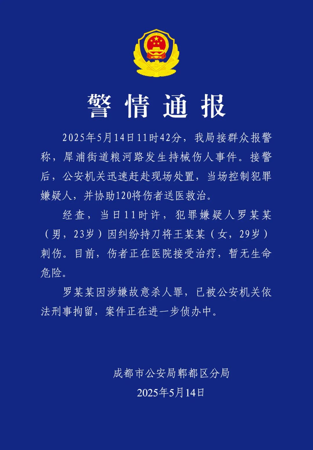 新京报讯 5月14日,成都郫都公安发布警情通报。