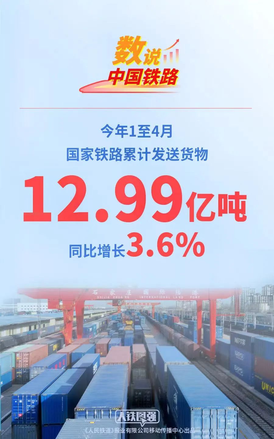新京报讯 据中国铁路微信公众号消息,今年1至4月,国家铁路累计发送货物12.99亿吨,同比增长3.6%;日均装车18万车,同比增长4.7%,为畅通国内国际双循环、保障国民经济平稳运行提供了有力支撑。