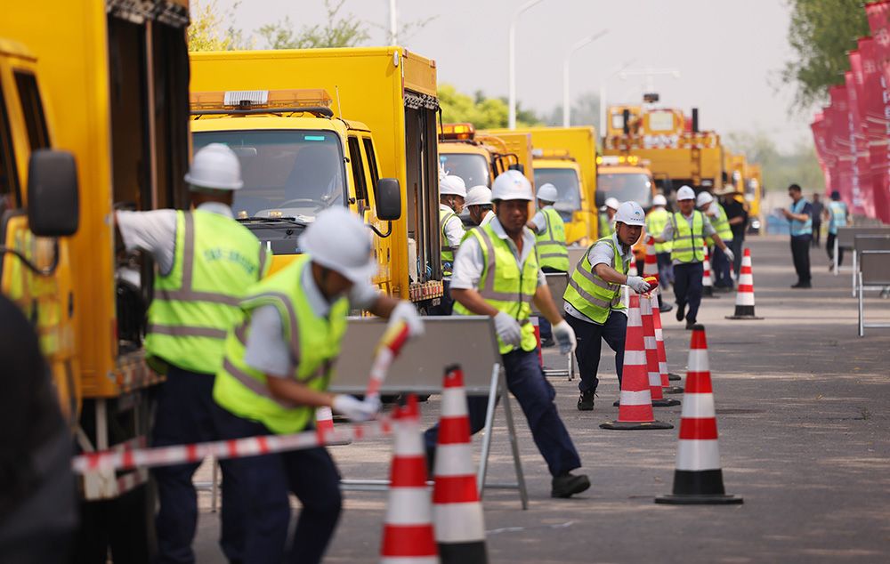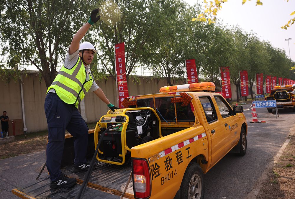 5月20日,北京排水集团2025年防汛抢险大比武决赛及大型抢险单元表演赛在清河第二再生水厂举办。图为大型抢险单元表演赛。