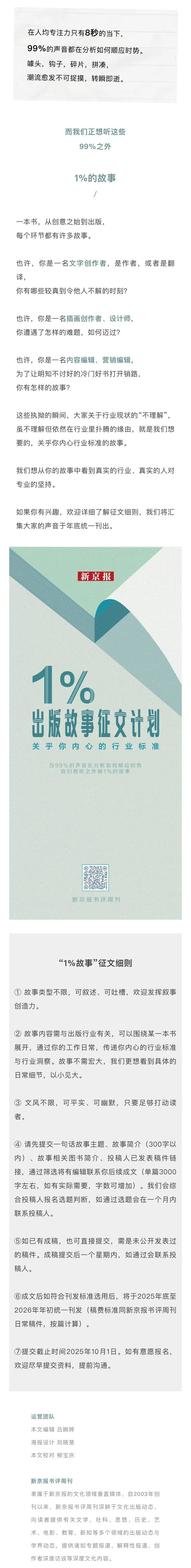 我们想从你的故事中看到真实的行业、真实的人对专业的坚持。欢迎搜索公号“新京报书评周刊”,打开5月27日推送的第二条进行扫码(也可点击文末的“阅读原文”)参加我们的出版故事征集活动。