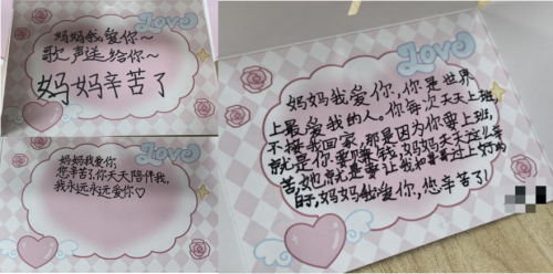 孩子们用稚嫩的笔触,写下对母亲最真挚的感激与爱意。一句句“妈妈我爱你,谢谢你辛苦了”,道出了最纯真的情感,也让妈妈们眼眶湿润。