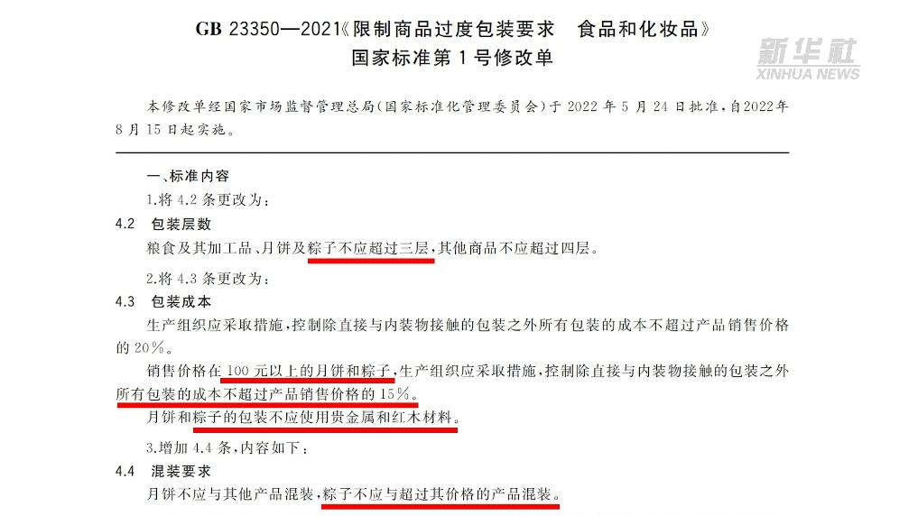 为了让粽子、月饼等包装“瘦身”,2022年8月15日,《限制商品过度包装要求 食品和化妆品》国家标准第1号修改单正式实施。其中,要求粽子包装层数最多不超过三层;售价在100元以上的粽子,包装成本占比应控制在15%以内;粽子的包装不应使用贵金属和红木材料;粽子不应与超过其价格的产品混装。
