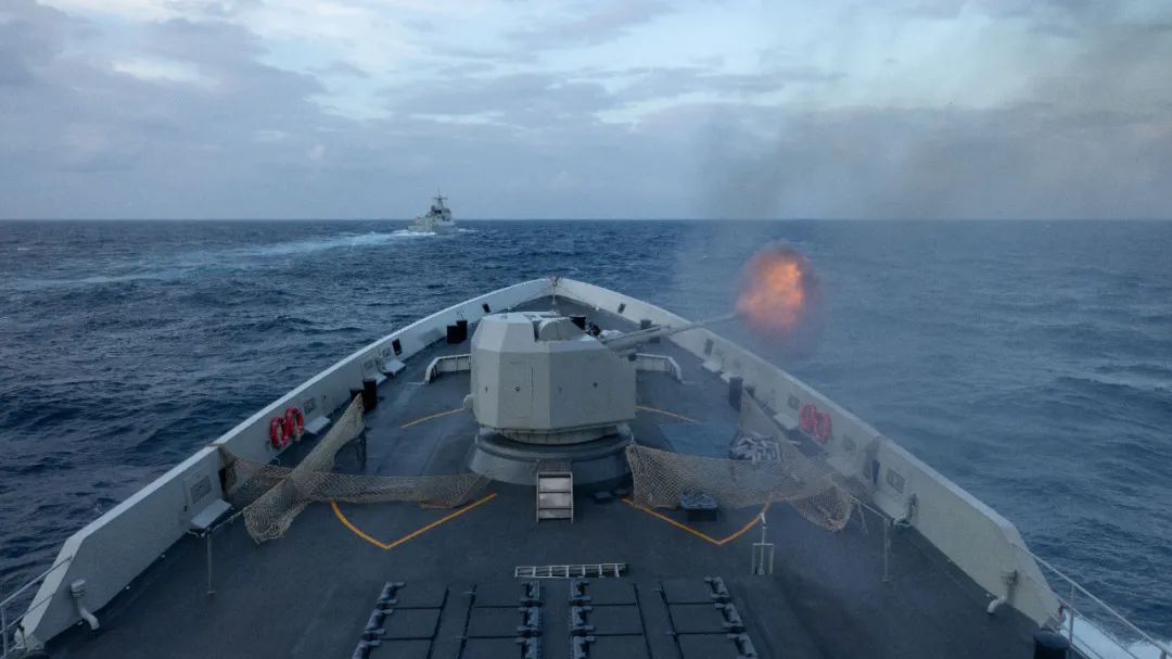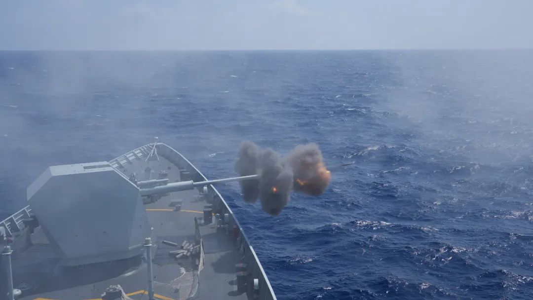 训练中,编队还围绕对岸射击展开专攻精炼。面对“敌”方岸基残存火力点,渭南舰通过舰载无人机校正目标坐标,并将目标属性推送至编队。编队各舰主炮交替实施打击,形成密集火力覆盖,成功命中目标。