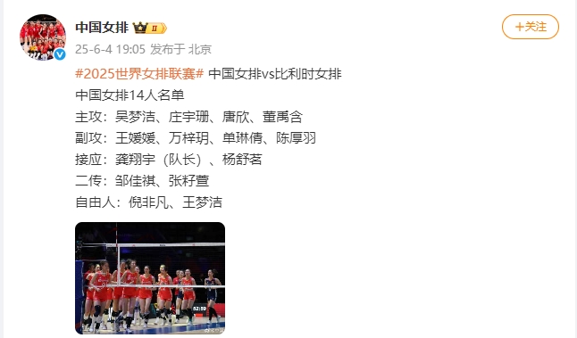 新京报讯 据@中国女排消息,2025世界女排联赛中国女排vs比利时女排,中国女排14人名单。